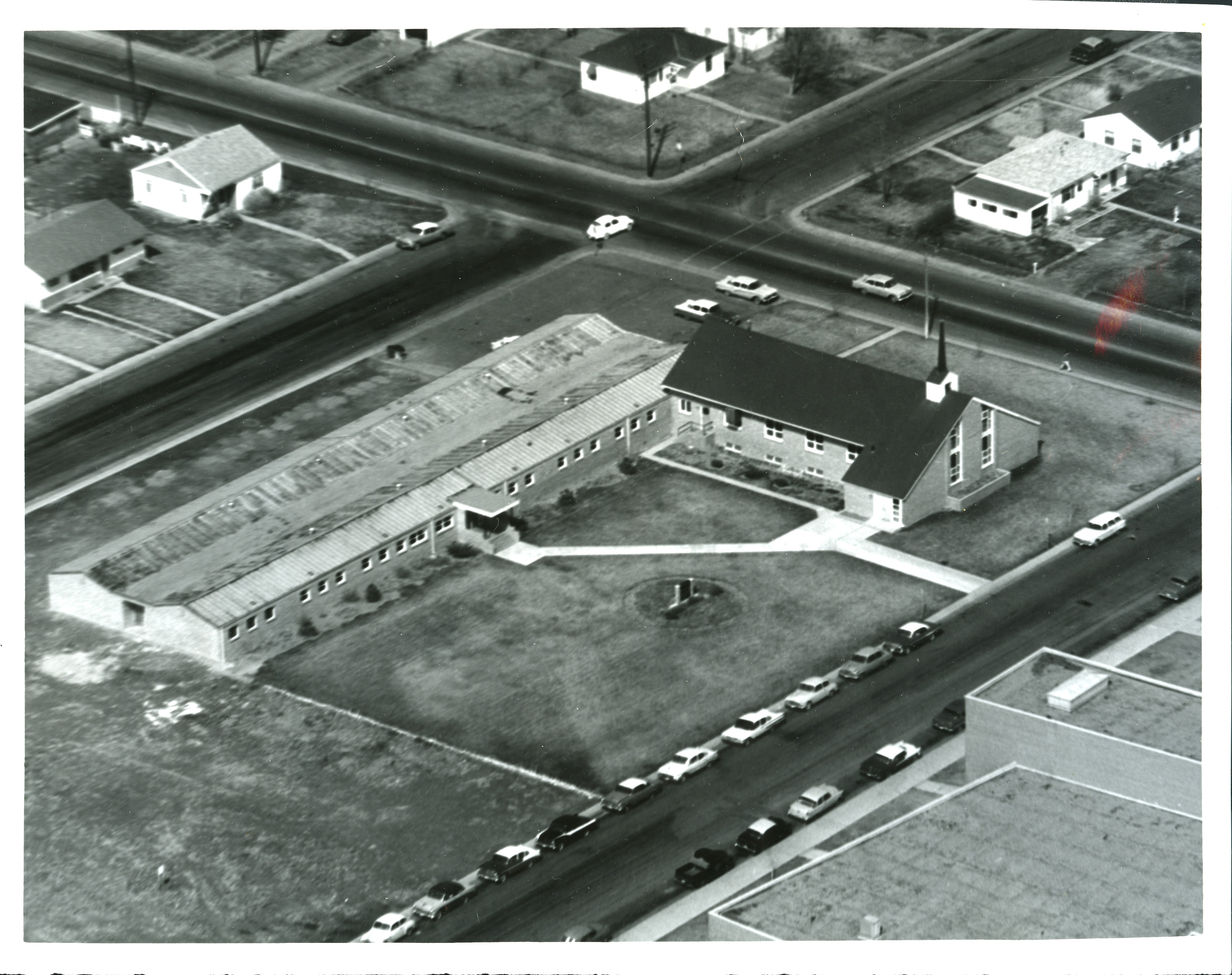 Aerial black & white photograph of Burns Memorial Methodist Church in the 1950s