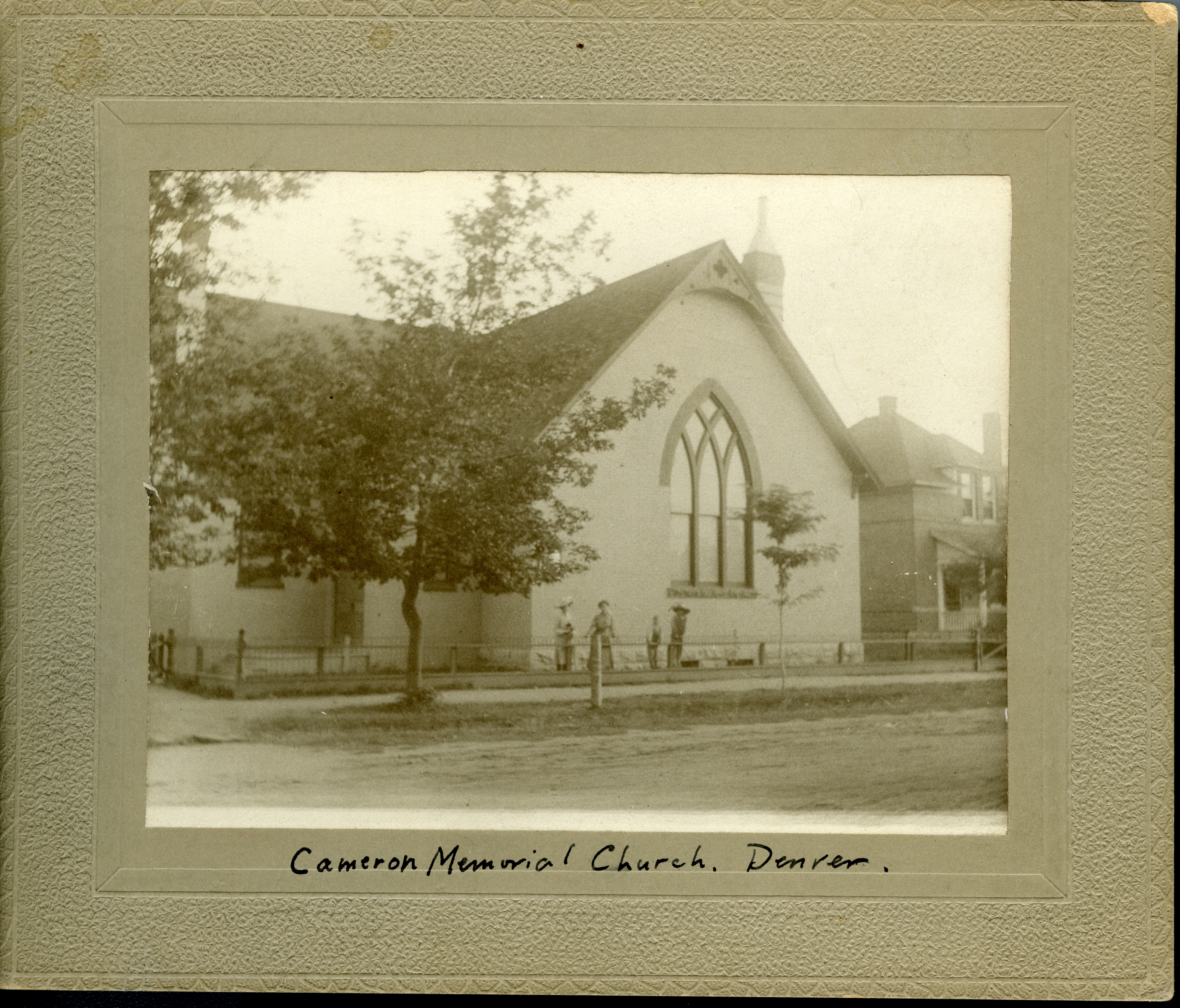 Early c. 1900s photograph of Cameron Memorial Church exterior with two women and two children leaning against the fence