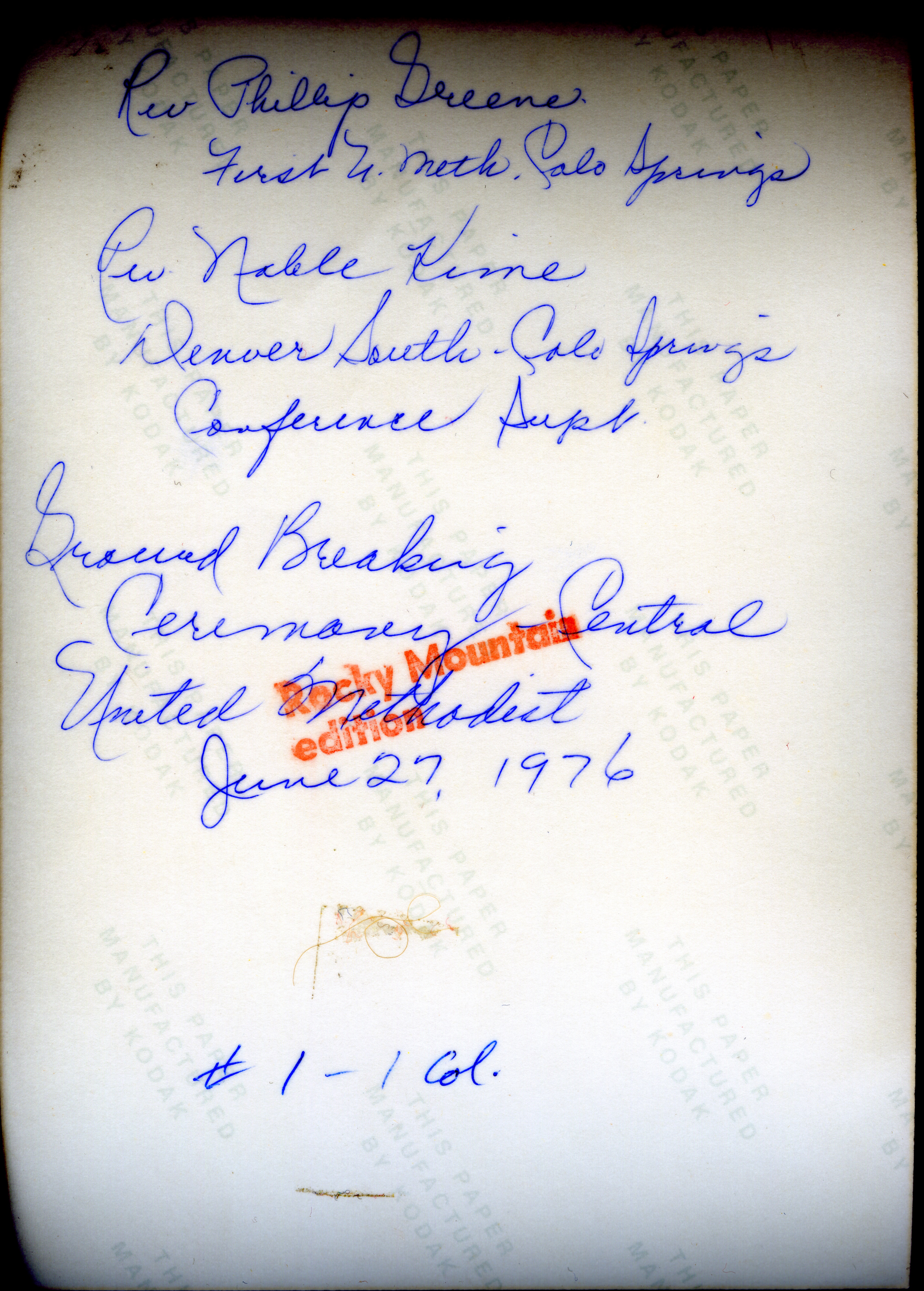 Handwritten notes on the back of black and white photograph from ground breaking ceremony on June 27, 1976