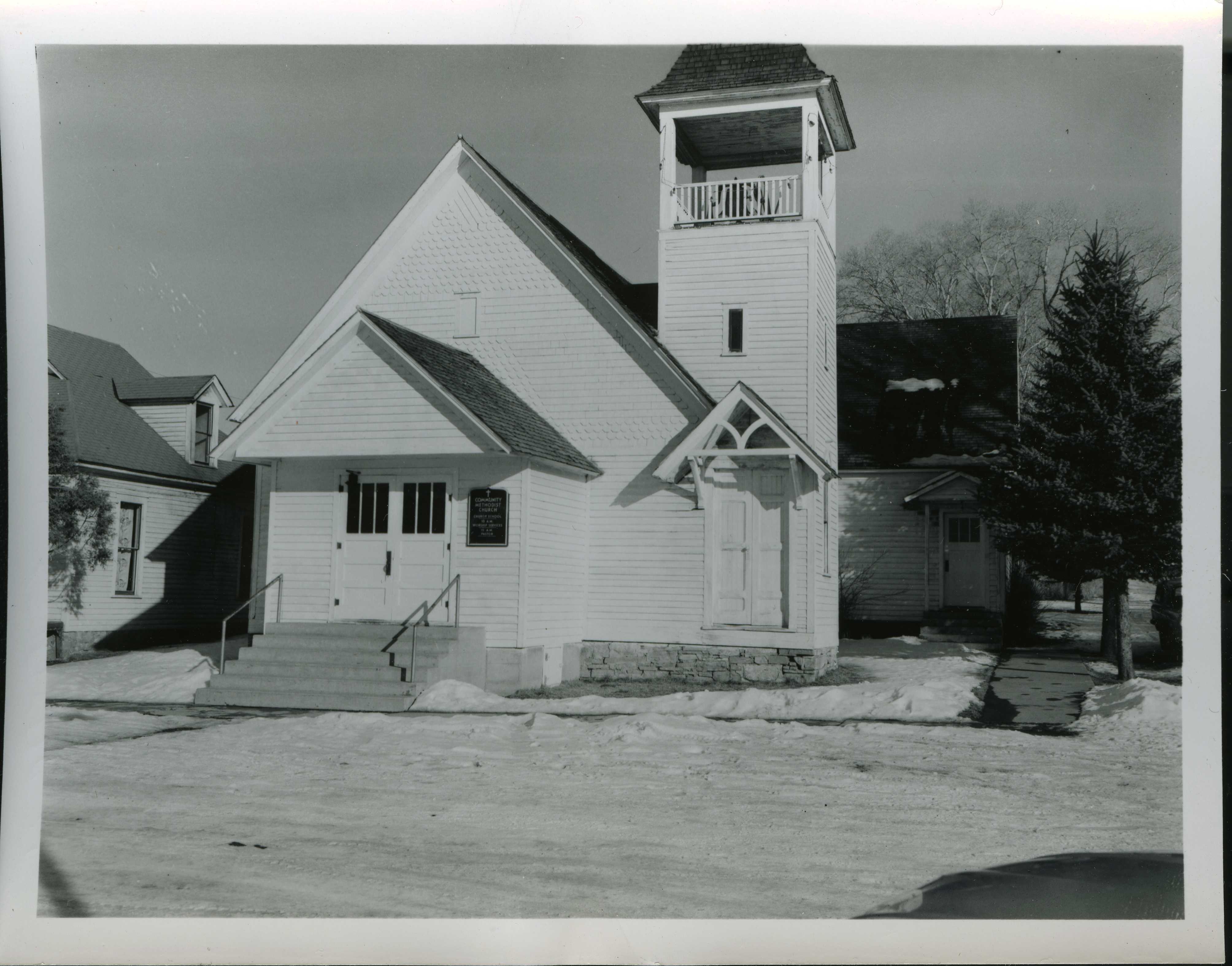 Photograph taken in 1960s of white church with bell tower in Eagle, Colorado from outside