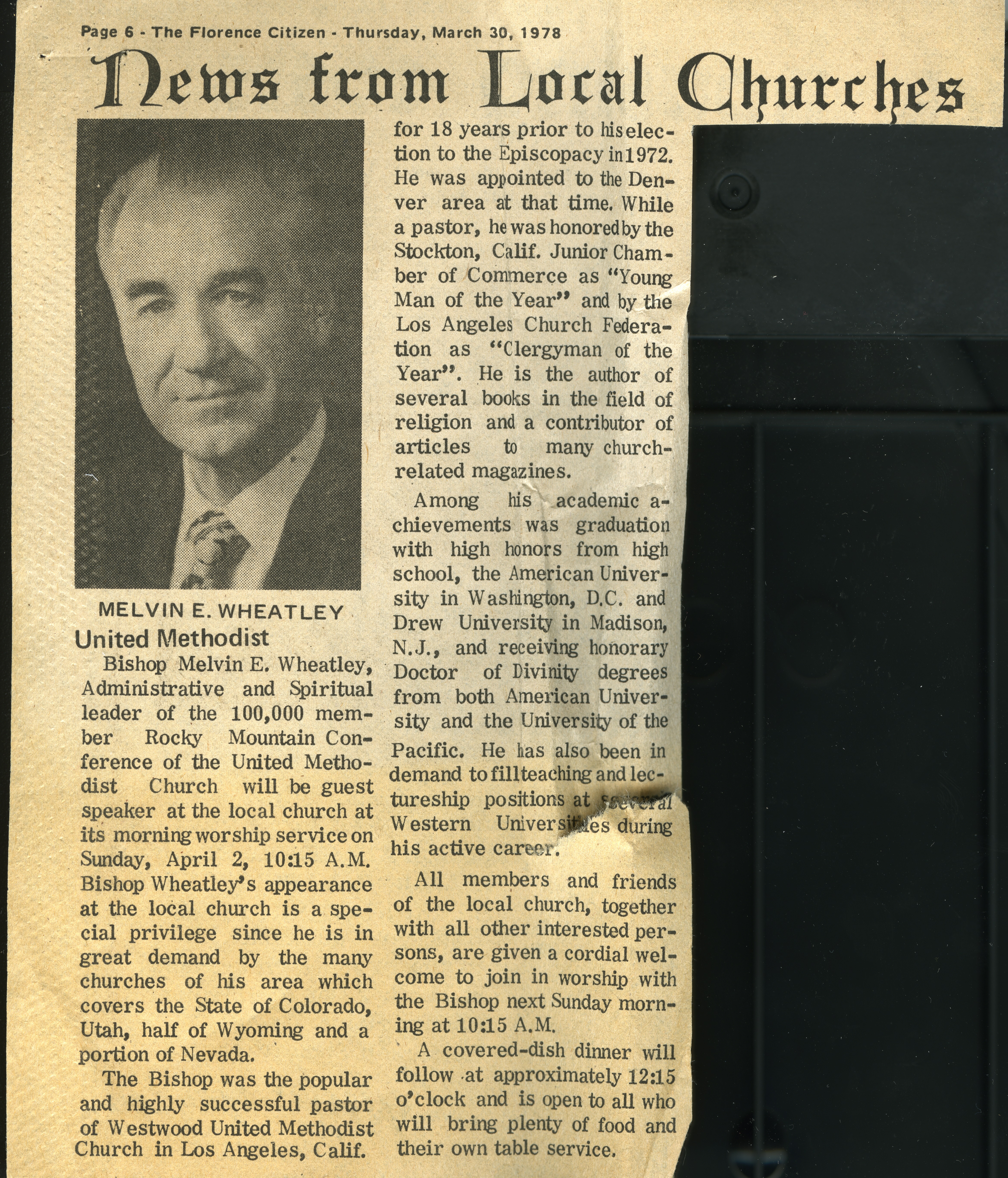 Newspaper article with photograph of Bishop Wheatley about his visit to the Florence UMC on April 2,1978