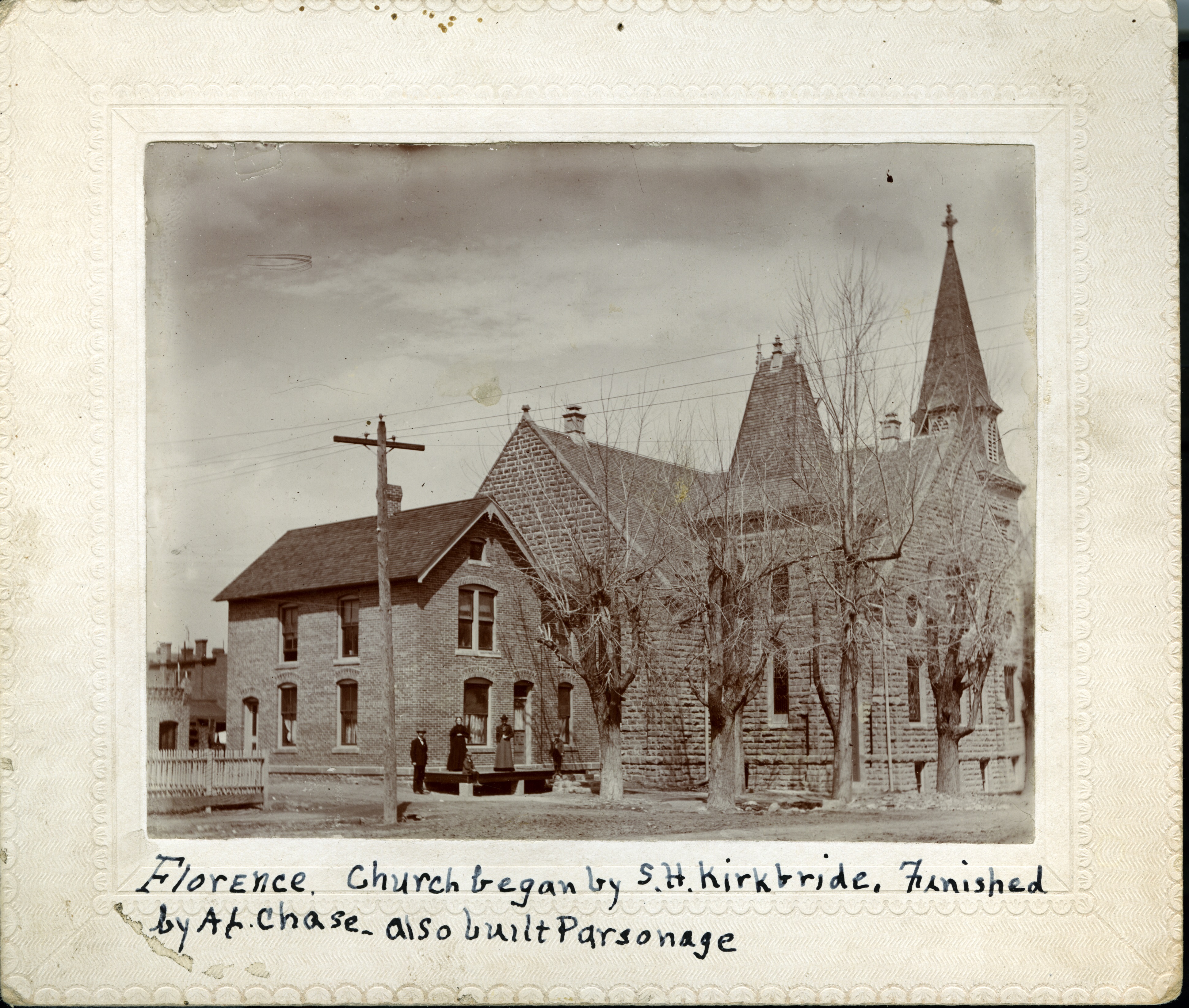 Photograph of early church building and parsonage from the early 1900s, with five people outside
