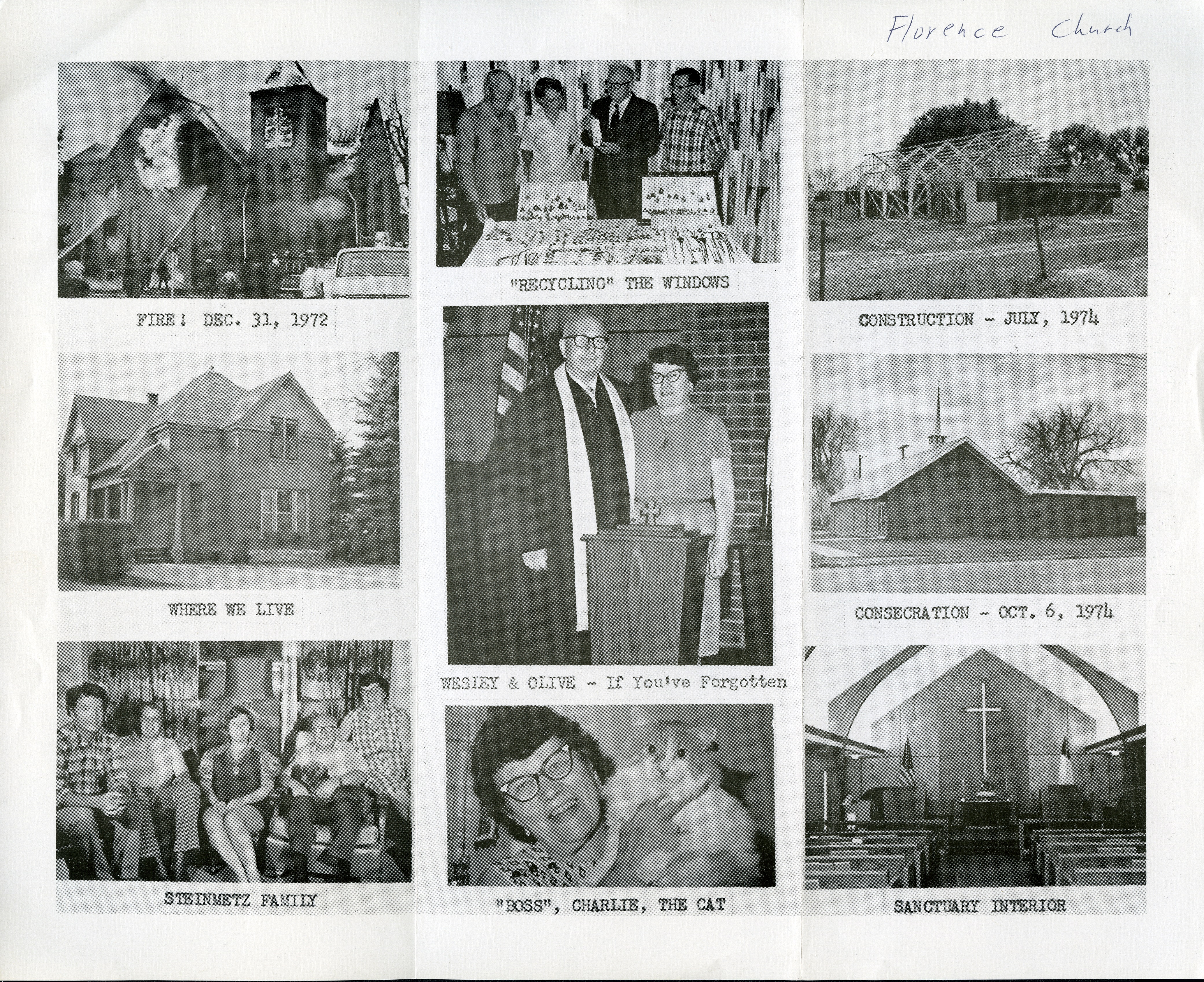Collection of nine photographs of Rev. and Mrs. Steinmetz and their family around the time the church burned down on December 31, 1972, and the new church exterior and sanctuary after it was rebuilt in 1974