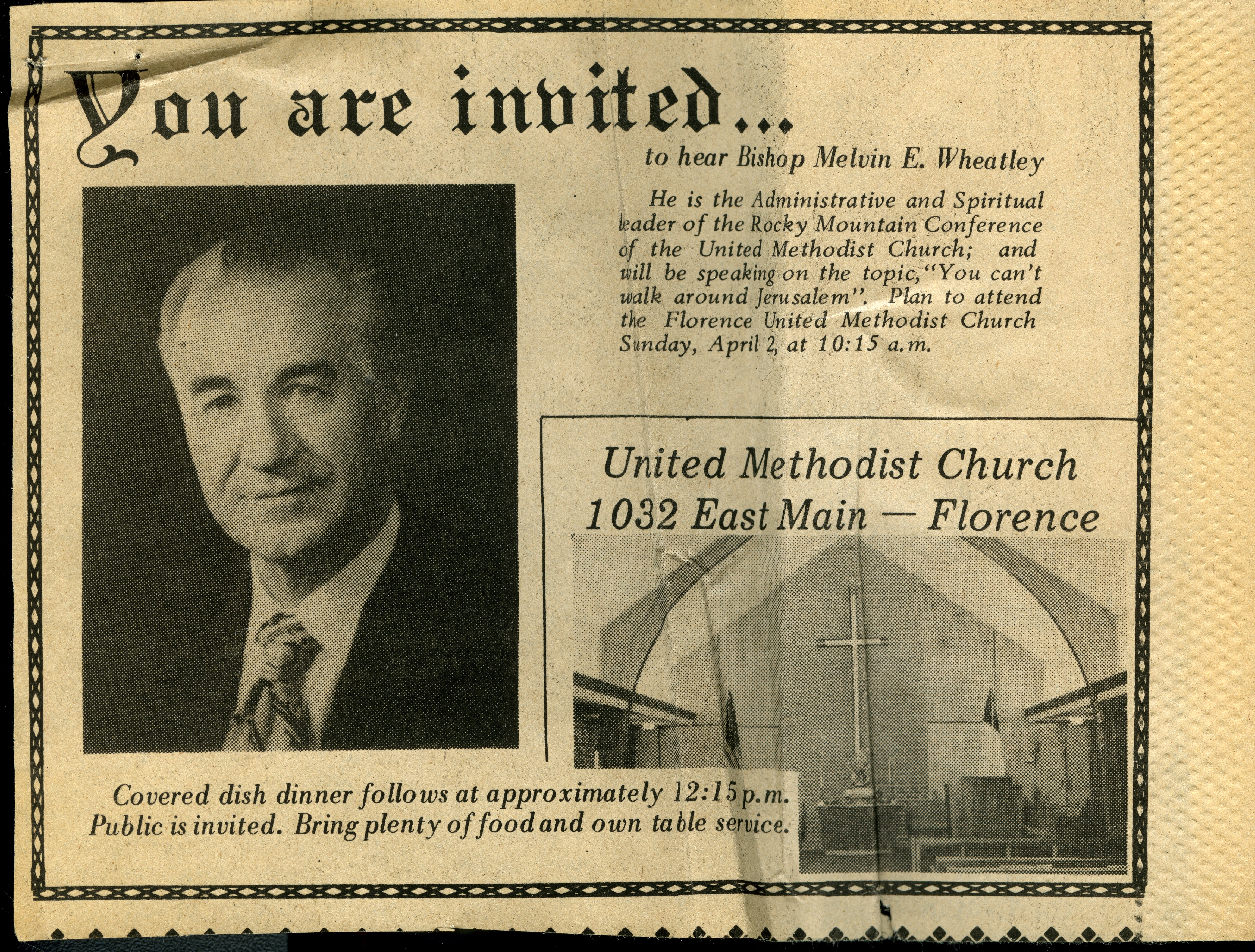 Newspaper ad taken out by the Florence UMC on the occassion of Bishop Wheatley coming deliver the sermon on April 2, 1978 with a headshot photograph