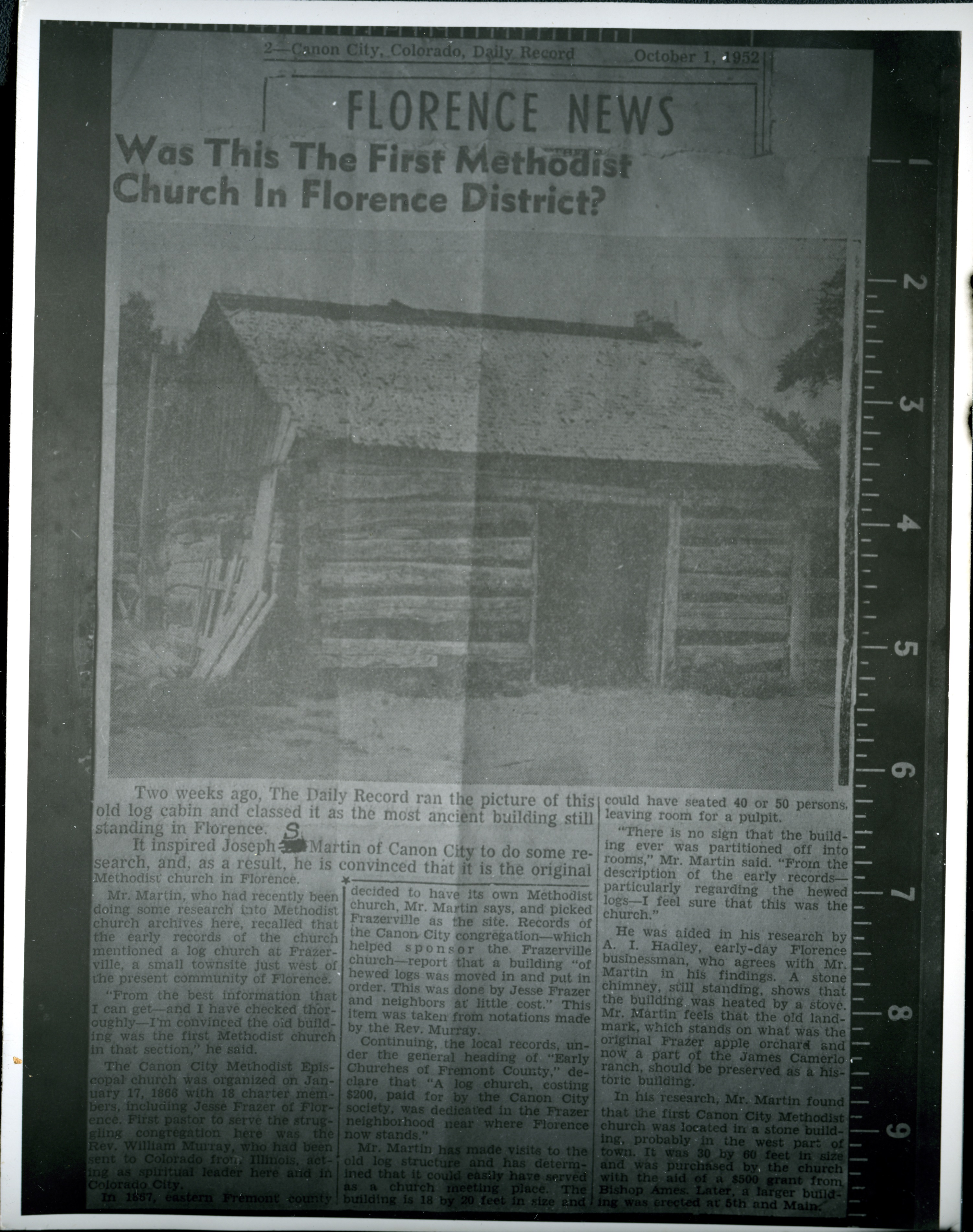 Photograph and newspaper article about "Uncle Jesse's" cabin, first used as a place of worship in Florence in the late 1800s