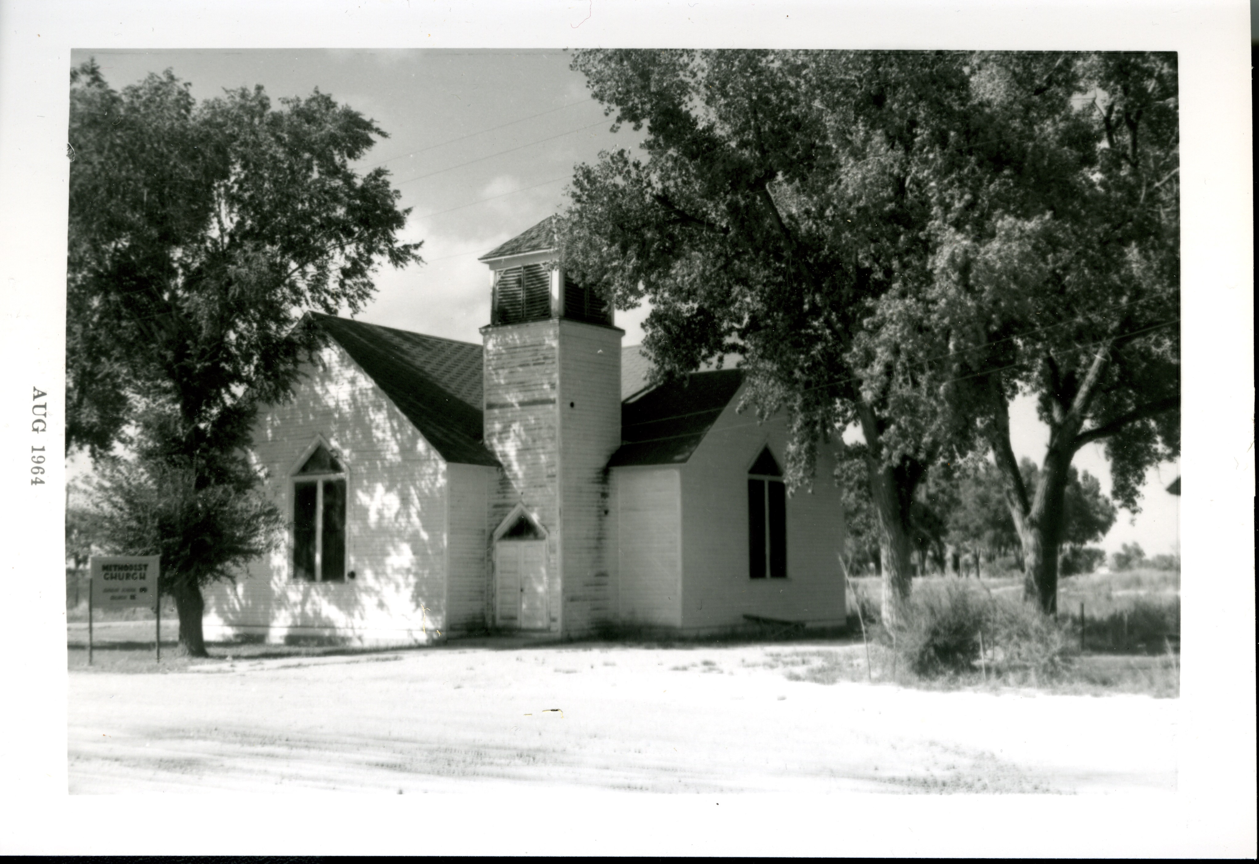 Black and white photograph of Granada Methodist Church in Granada, Colorado taken in August 1964.