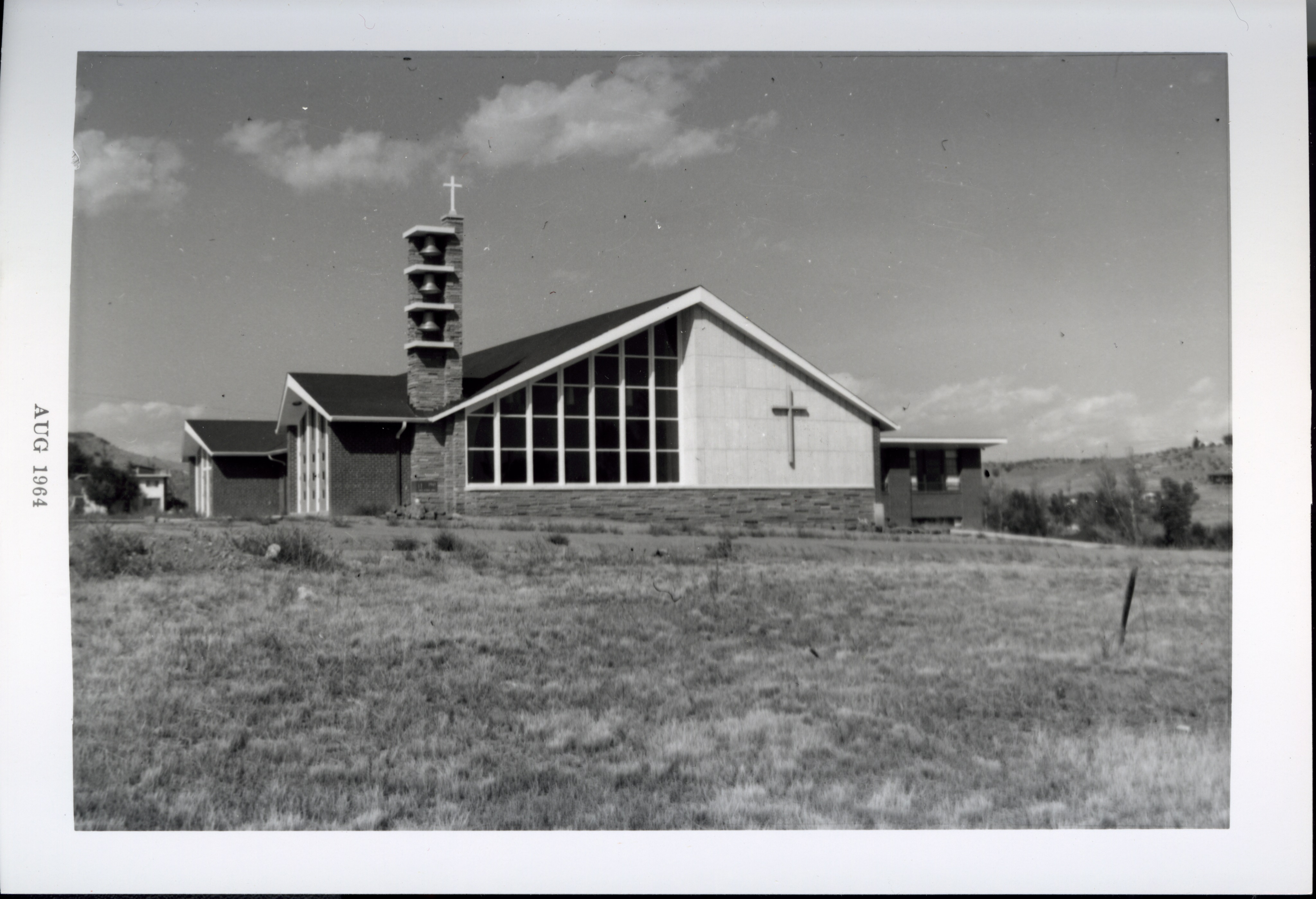 Black and white photograph of the exterior of Trinity United Methodist Church taken in August 1964
