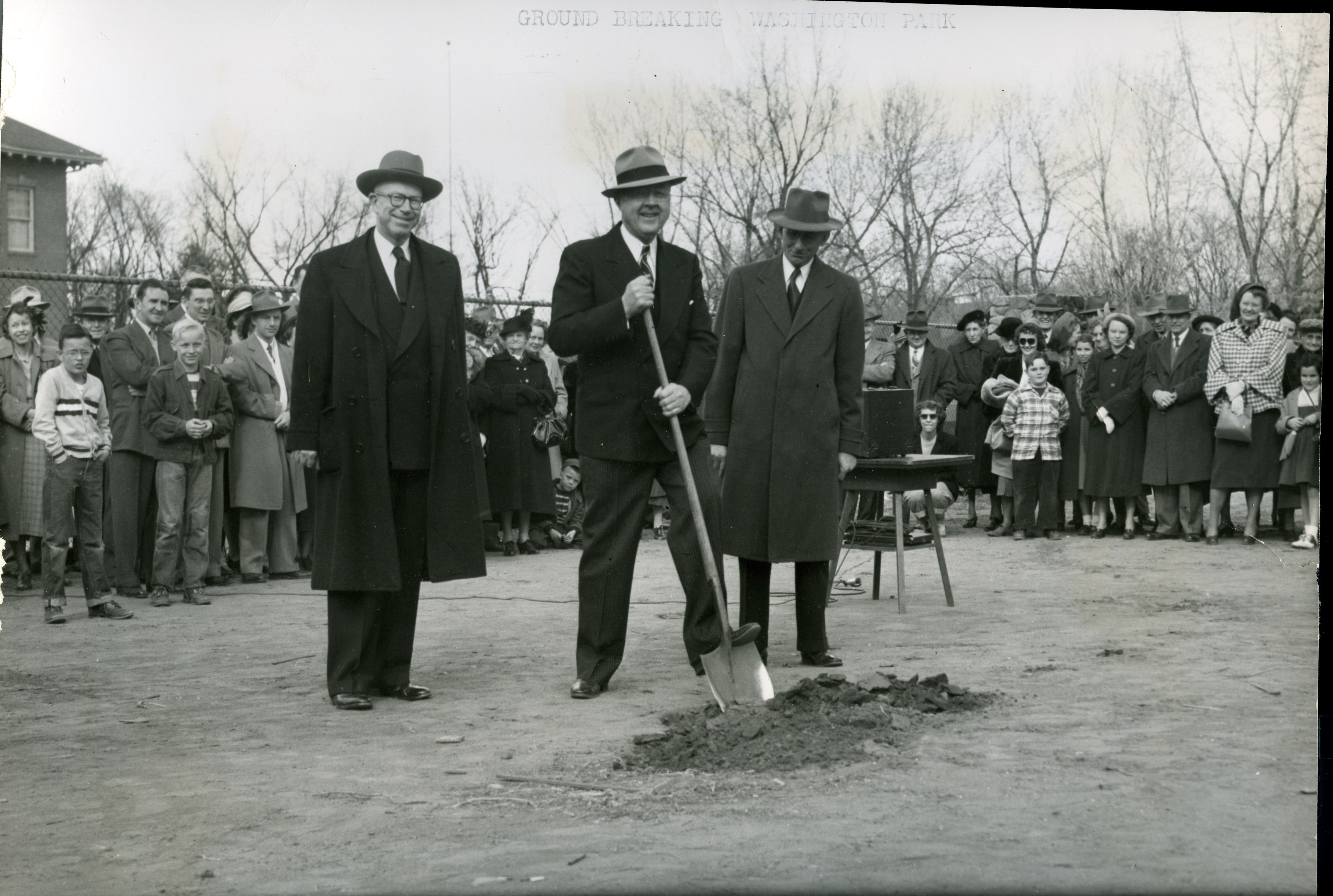 Black and white photograph of a man with a shovel surrounded by congregation at the ceremonial ground-breaking service for the church school expansion in 1951